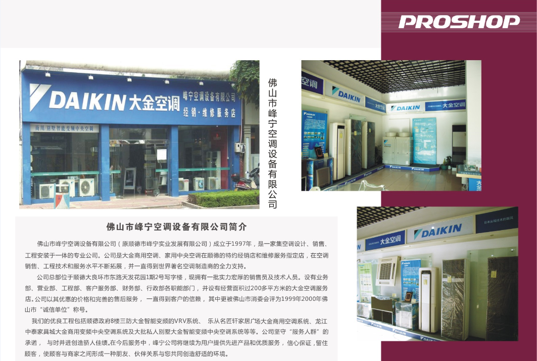 佛山峰宁空调设备有限公司(原顺德市峰宁实业发展有限公司)于一九九七年建立,多年来在空调销售、工程技术和服务水平上不断拓展,并一直得到世界著名空调制造商的全力支持。公司是佛山市最具规模的专业空调设备销售及工程商之一,自2002年起已成为大金空调特约经销店及大金空调特约维修店、2006年成为麦克维尔商用及家用空调特约经销商。一九九九年被佛山市消委会评为1999年-2000年,佛山市“诚信单位”称号。公司自置500多平方米的办公场所物业,拥有强大的专业设计队伍及空调安装、维修工程队伍。是一间集空调专业销售,专业设计,专业安装,专业服务的公司,以其优惠的价格和完善的售后服务,受到客户的信赖,以优良工程完成了顺德政府8楼三防大金智能变频的VRV系统、乐从名匠轩家居广场250匹大金商用空调系统、乐从新家具城顺联北区一至十座70000平方米空调安装工程;龙江中泰家具城大金商用变频中央空调系统、顺德区第一人民医院美的MDV中央空调工程;桂畔上东别墅综合楼大金中央空调安装工程及一批私人别墅大金智能变频中央空调系统等。